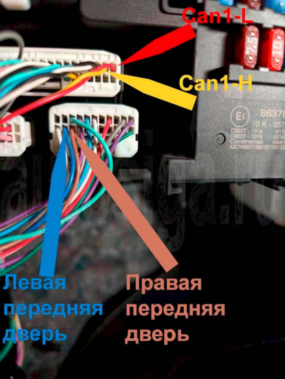 Can1-H- жёлтый,Can1-L- красный,концевик левой передней двери(-) - синий,концевик правой передней двери(-) - коричневый
