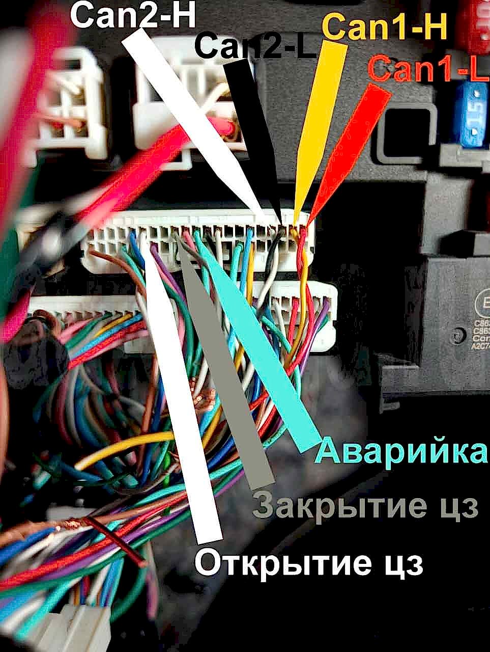 Can1-H- жёлтый,Can1-L- красный,Can2-H- белый,Can2-L- чёрный,аварийка(-) - салатовый,запирание цз(-) - серый,отпирание цз(-) - белый